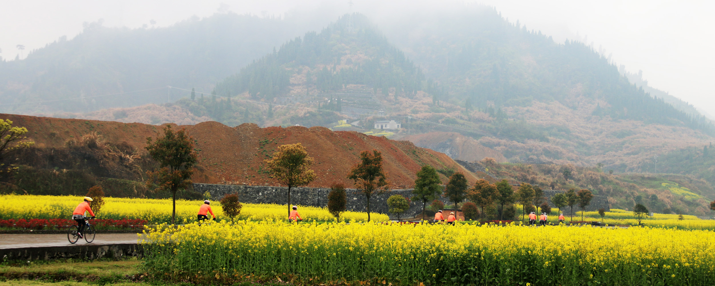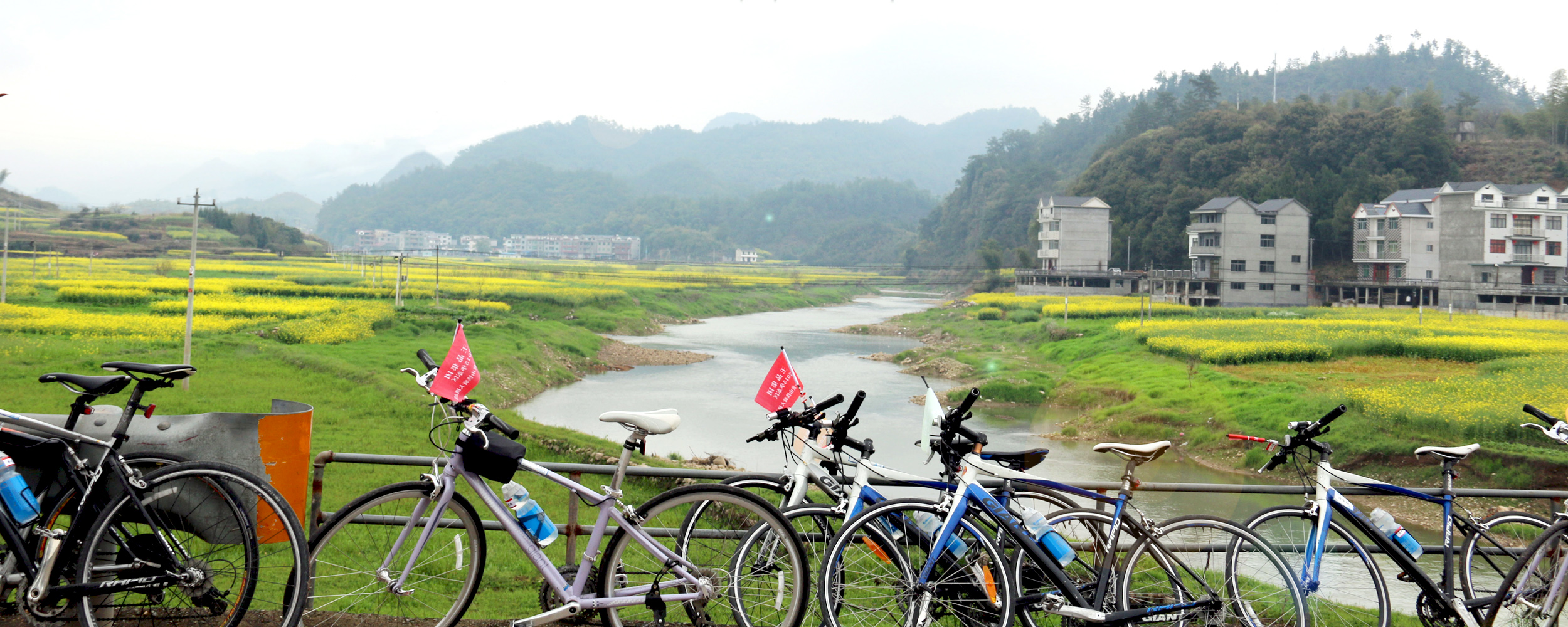 从汾开镇出来,我们便渐渐远离千岛湖,开始进入浙赣边境的山区,路况较第一天 会有起伏,有时也会变得较为狭窄,但路面良好。今天整条路线蜿蜒于山谷之间,初 春时节,金黄的油菜花开遍田野,山坡上梯田状的成片的茶树也吐露新芽。骑着单车, 穿行在幽静美丽的山谷,还能在路过的村庄中发现古老的房屋,此刻,烦恼已从心中 逃离的无影无踪。